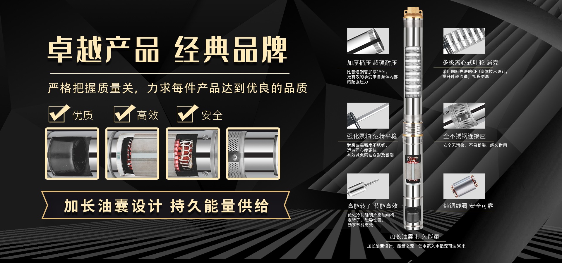 不僅僅是泵,更是流動(dòng)的科技。十多年來,本公司堅(jiān)持走:以質(zhì)量求生存以科技創(chuàng)新求發(fā)展,重合同守信用的道路,生產(chǎn)經(jīng)營得到迅速發(fā)展。更希望以后不管從發(fā)達(dá)城市到新農(nóng)村,從工業(yè)制造到尖端科技產(chǎn)業(yè)都隨處可見創(chuàng)江井泵的身影,創(chuàng)江深井泵已成為干萬用戶心目中優(yōu)質(zhì)和信心的保證我們將以優(yōu)質(zhì)的產(chǎn)品和最完善的售后服務(wù)來真誠與各界朋友開展廣泛的合作,共同創(chuàng)造一個(gè)美好的未來!